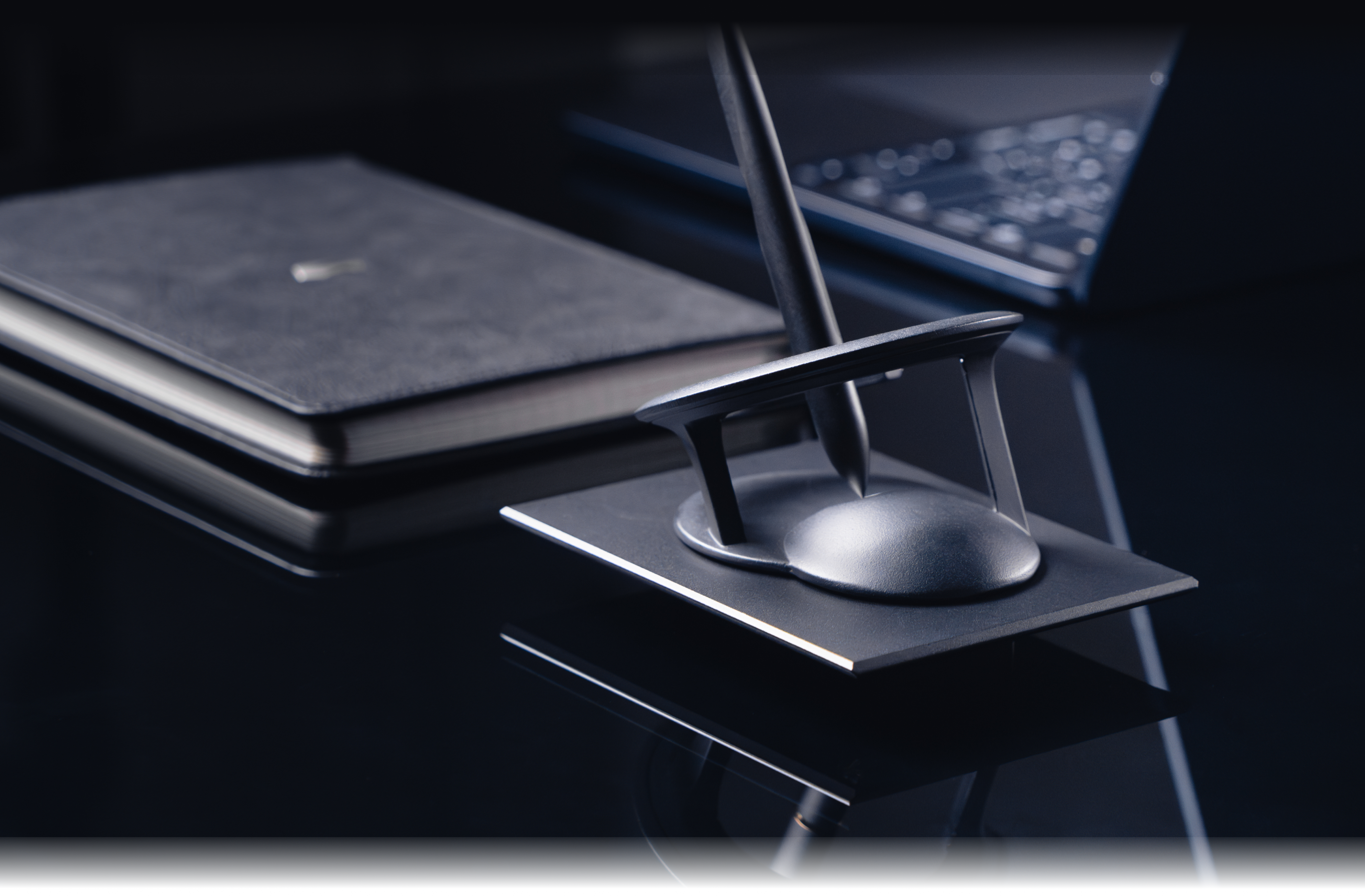 Evocando un senso di spazio esterno a livello degli occhi, questo geniale supporto in alluminio valorizza la Hoverpen e gli accessori da scrivania.
