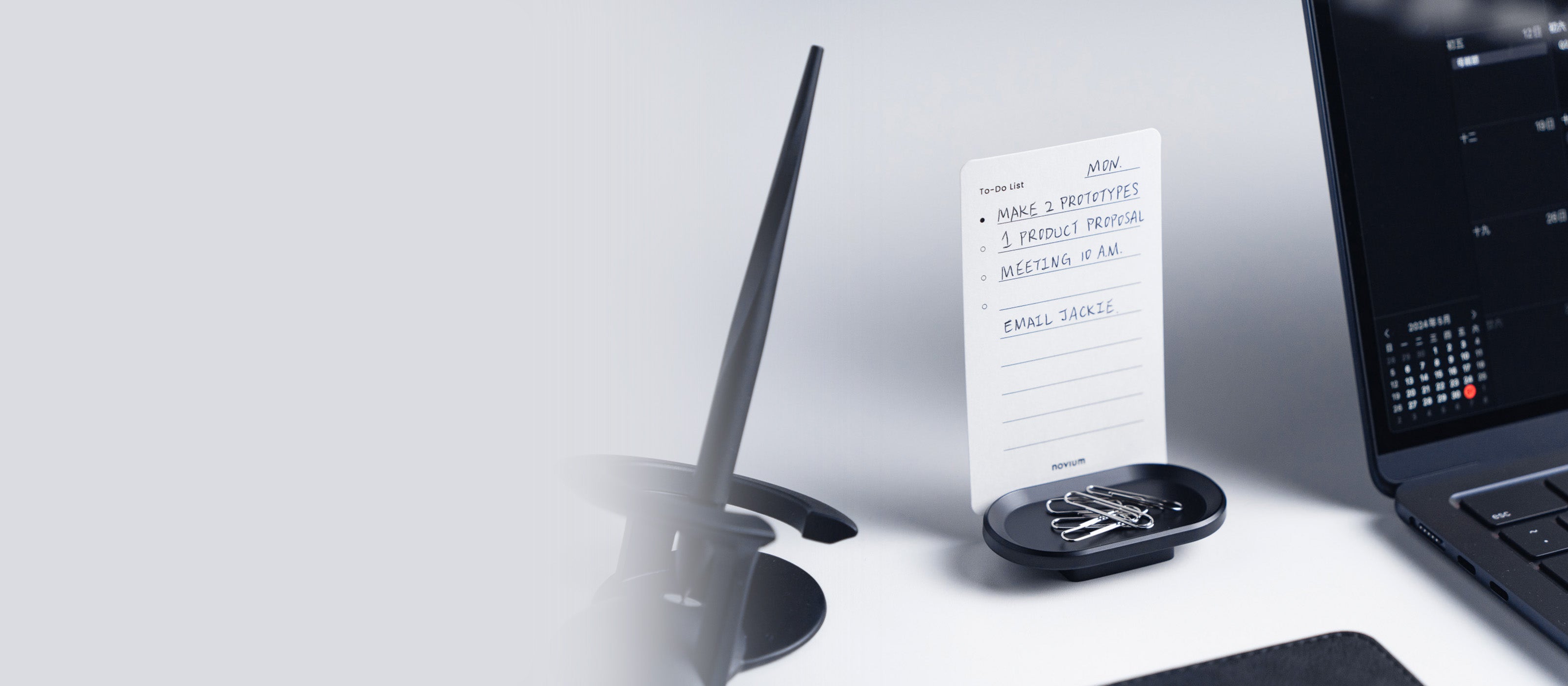 In addition to holding note cards, you can also use it to display business cards or name tags. Place it on the desktop with a Hoverpen to perfectly complement its sleek & unique style.